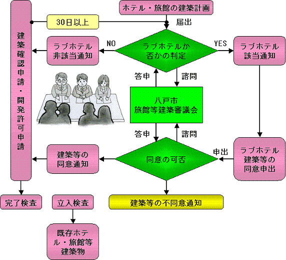 - ホテル・旅館がラブホテルに該当しない場合、または、八戸市旅館等建築審議会を経て、市長の同意を得た場合は建築確認申請等へ手続きを進めることができます。