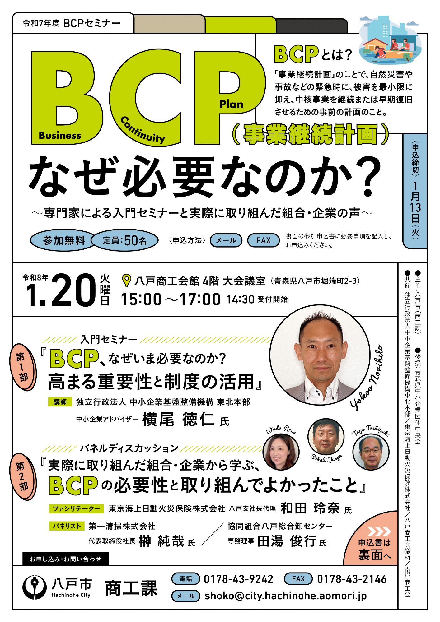 八戸市では、今年度もBCPやジギョケイを知ってもらうためのセミナーを開催します。「BCPやジギョケイ、聞いたことはあるけどよく分からない」といった方にも、全国の策定事例を紹介しながら、概要を分かりやすく説明するとともに、策定のメリットもご紹介しますので、この機会にぜひご参加ください。