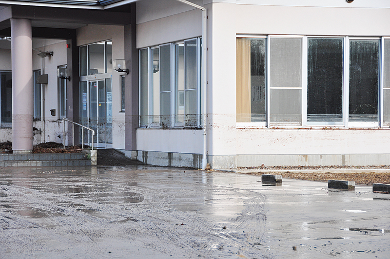 老人いこいの家海浜荘の被害の様子。外壁に浸水の跡がはっきりと残る。