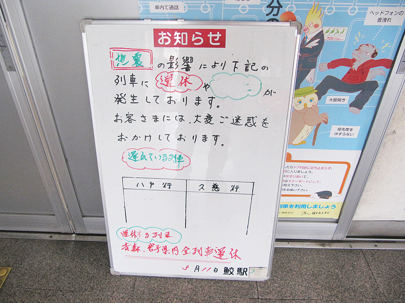 地震発生から約1時間後の鮫駅周辺の様子。停電のため信号機が消えている。
