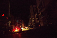 地震発生翌日の夜の中心街の様子。電力が復旧せず、車の明かりだけが光る。