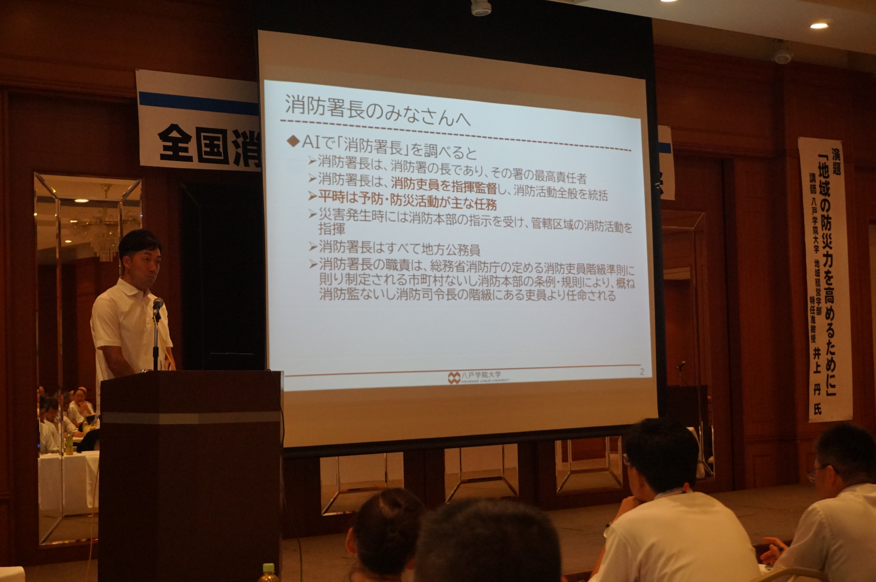 令和7年8月26、27日の2日間で全国消防長会東北支部消防署長研修会を実施し、121名が受講しました。研修会には講師として八戸学院大学准教授の井上様、劇団やませ様及び八戸市立病院医師の吉村様からご講演いただきました。