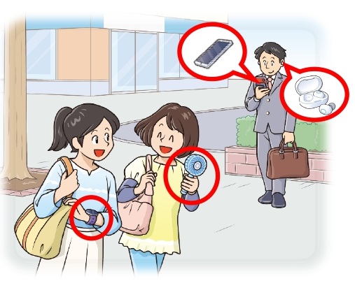 リチウムイオン電池は、モバイルバッテリーやスマートフォンのほか、ワイヤレスイヤホン、スマートウォッチ、携帯用扇風機など、日常生活で身に着けたり、持ち歩いたりする様々な製品に使用されています。