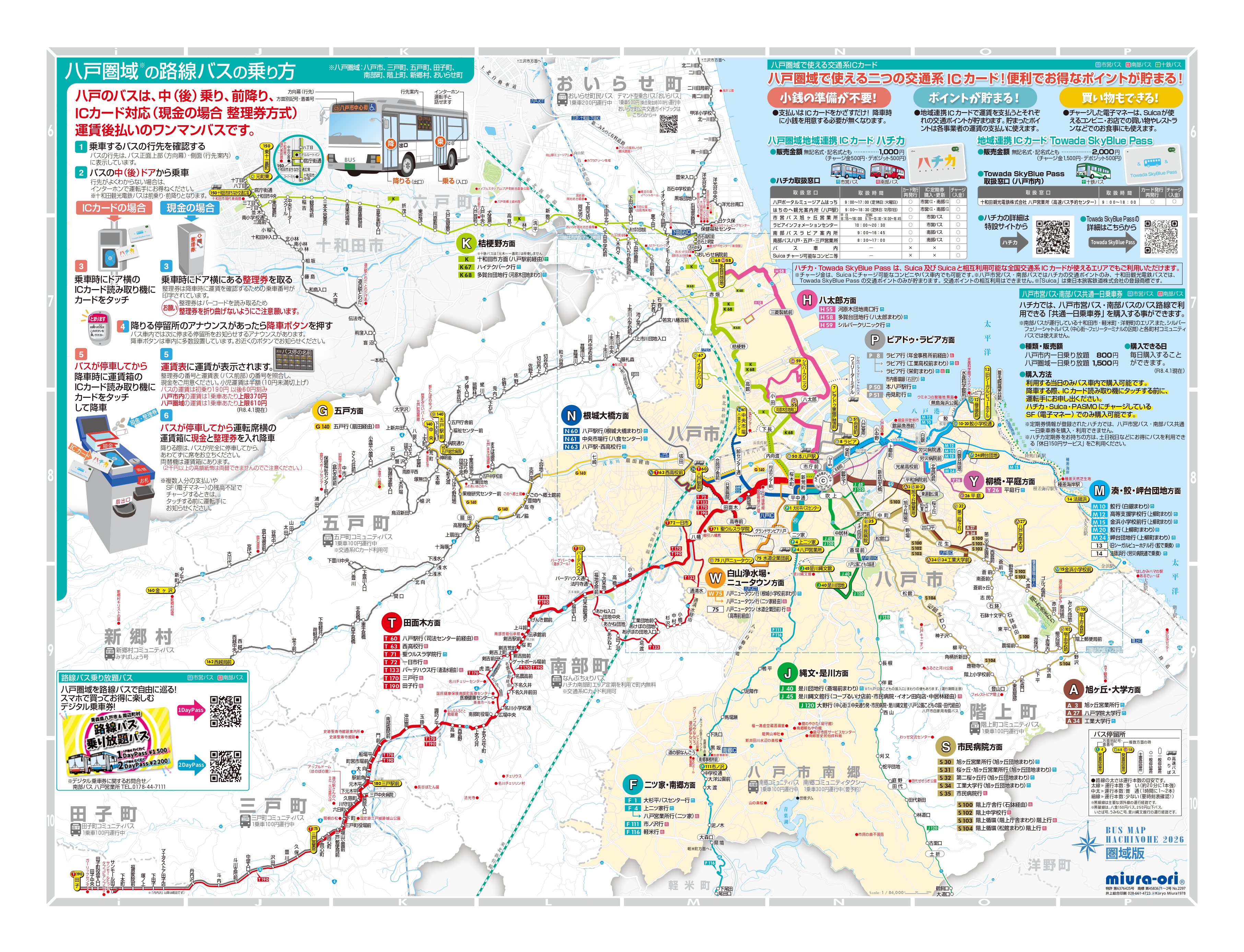 「バスマップはちのへ」は、八戸市内・圏域で路線バスを運行している八戸市営バス、南部バス、十和田観光電鉄バスの路線図を集約するとともに、わかりやすさに配慮し、中心街から放射状に形成される市内・圏域バス路線網を方面別のアルファベット記号と路線ごとのカラーリングで表現しています。