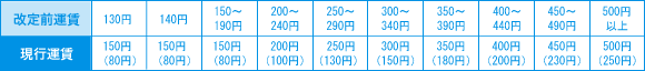 ※( )は小児運賃(改定運賃の半額になり、10円単位に切上げとなります。)