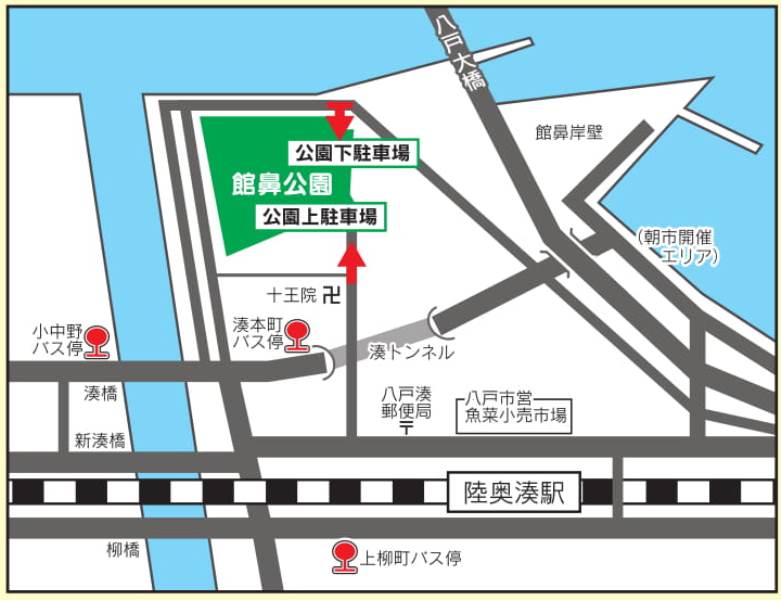 - JR八戸線 陸奥湊駅下車 徒歩約10分