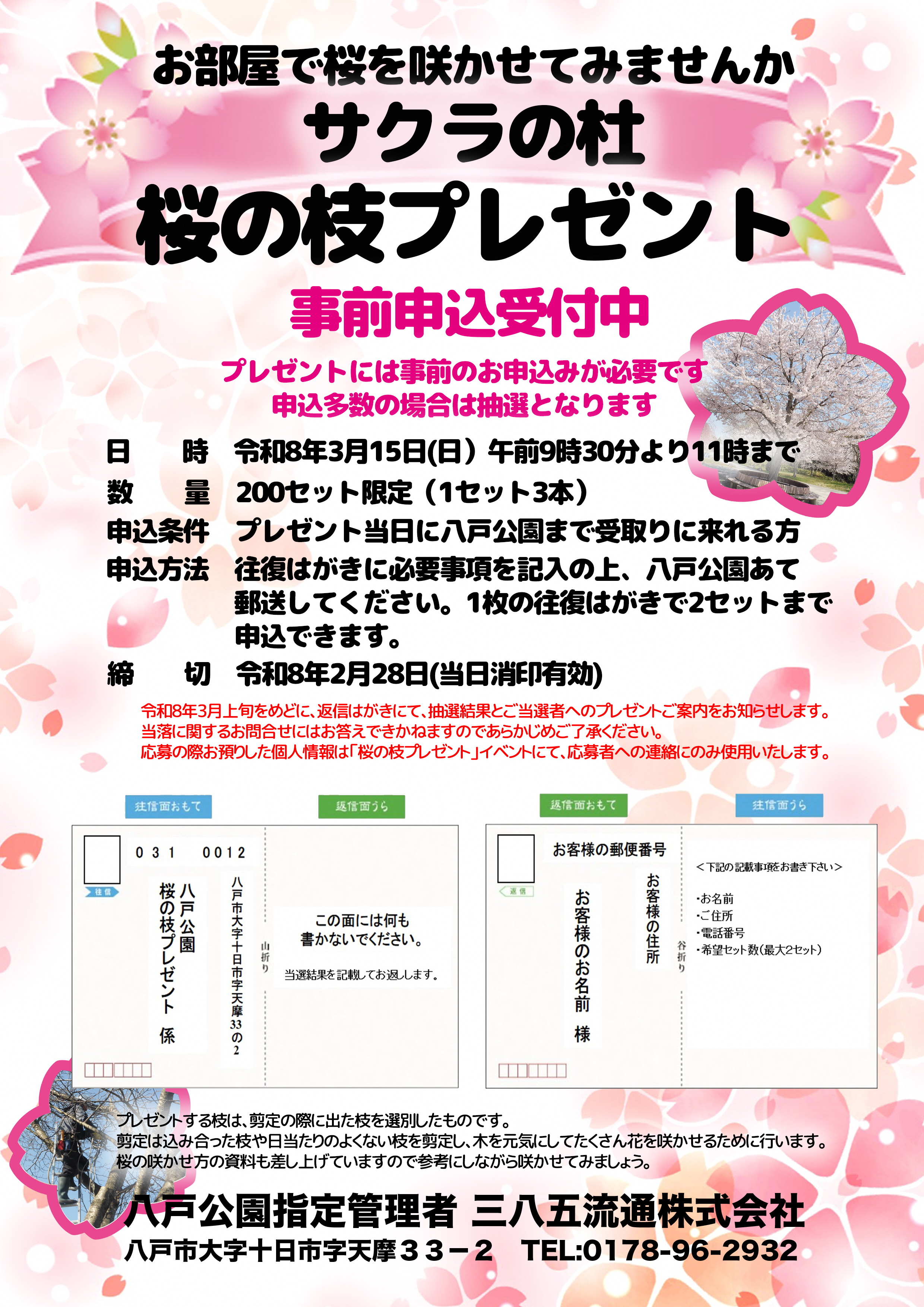 - 申込方法:往復はがきで「〒031-0012 八戸市大字十日市字天摩33の2 八戸公園 桜の枝プレゼント係」まで