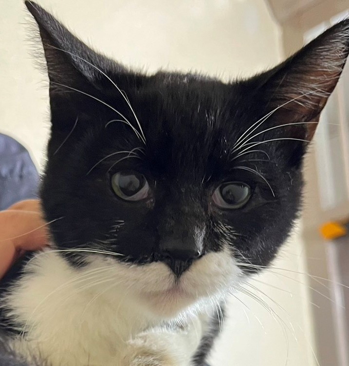 | 名前:ジン 種類:ミックス 毛色:黒白 性別:オス 体重:2.8キログラム 年齢:推定1歳前後 |