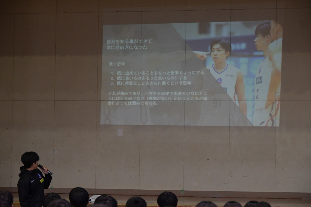 小学校のときにバスケットボールを始め、一度は挫折を味わってやめたことはありながらもずっとバスケットを続けてきて、「挫折を味わったからこそ全てを前向きに考えられるようになった」というご自身の経験をもとにお話しいただきました。
