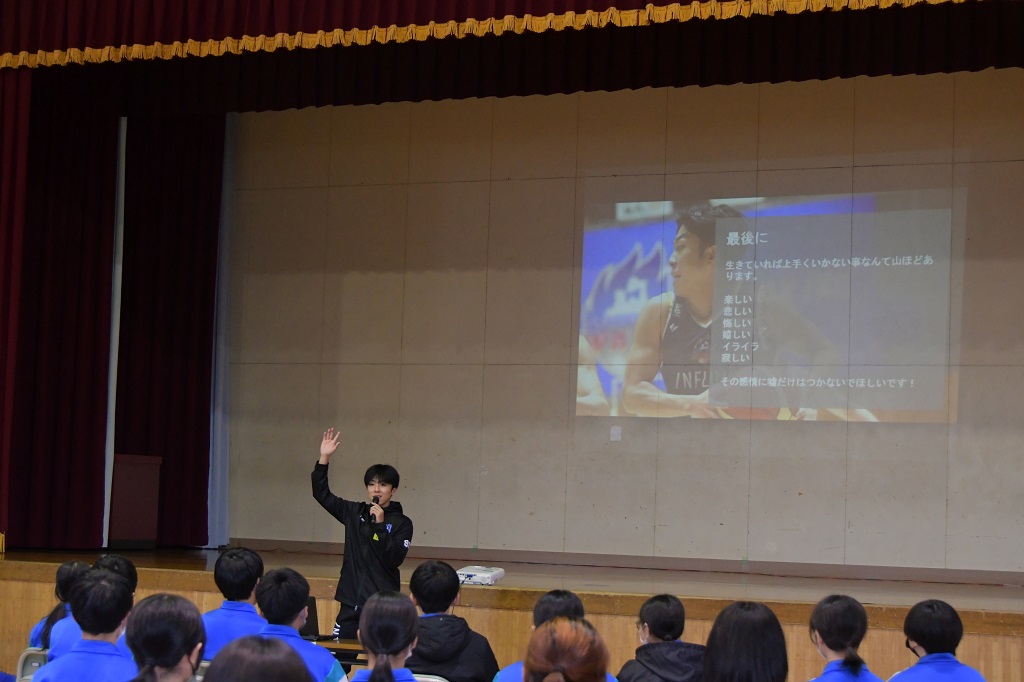 「前半の寺嶋スキルコーチの講演は分かりやすい内容で生徒の心に響き、後半のスポーツ教室は大変盛り上がり、楽しめるような企画にしていただいた」と担当の先生。