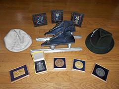 奥はモットーとする言葉とスケート靴、五輪の帽子(左)とグルノーブルで購入した愛用の帽子(右)、手前は受賞メダル(個人蔵)