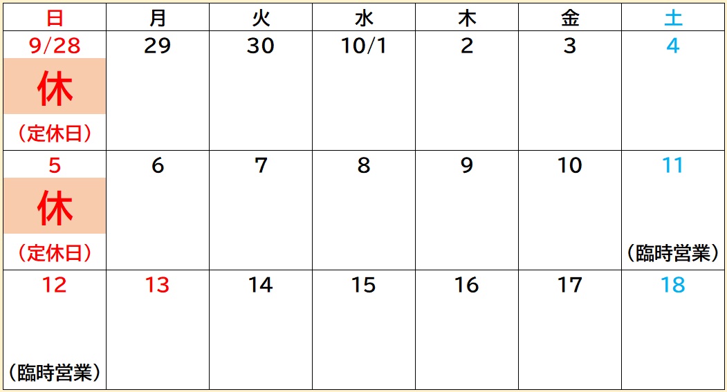 - 定休日にあたる令和7年10月11日(土曜)と12日(日曜)は臨時営業します。
